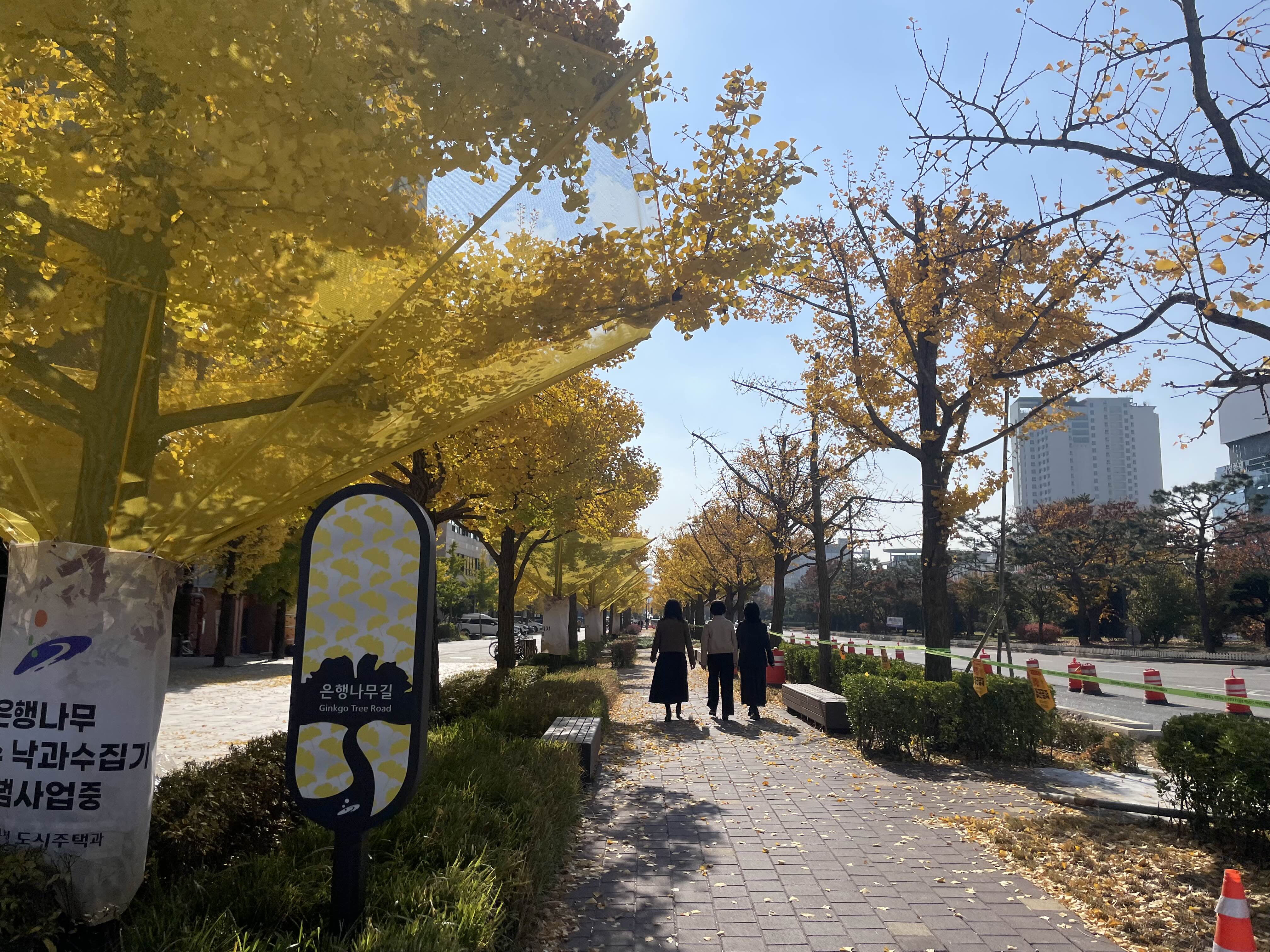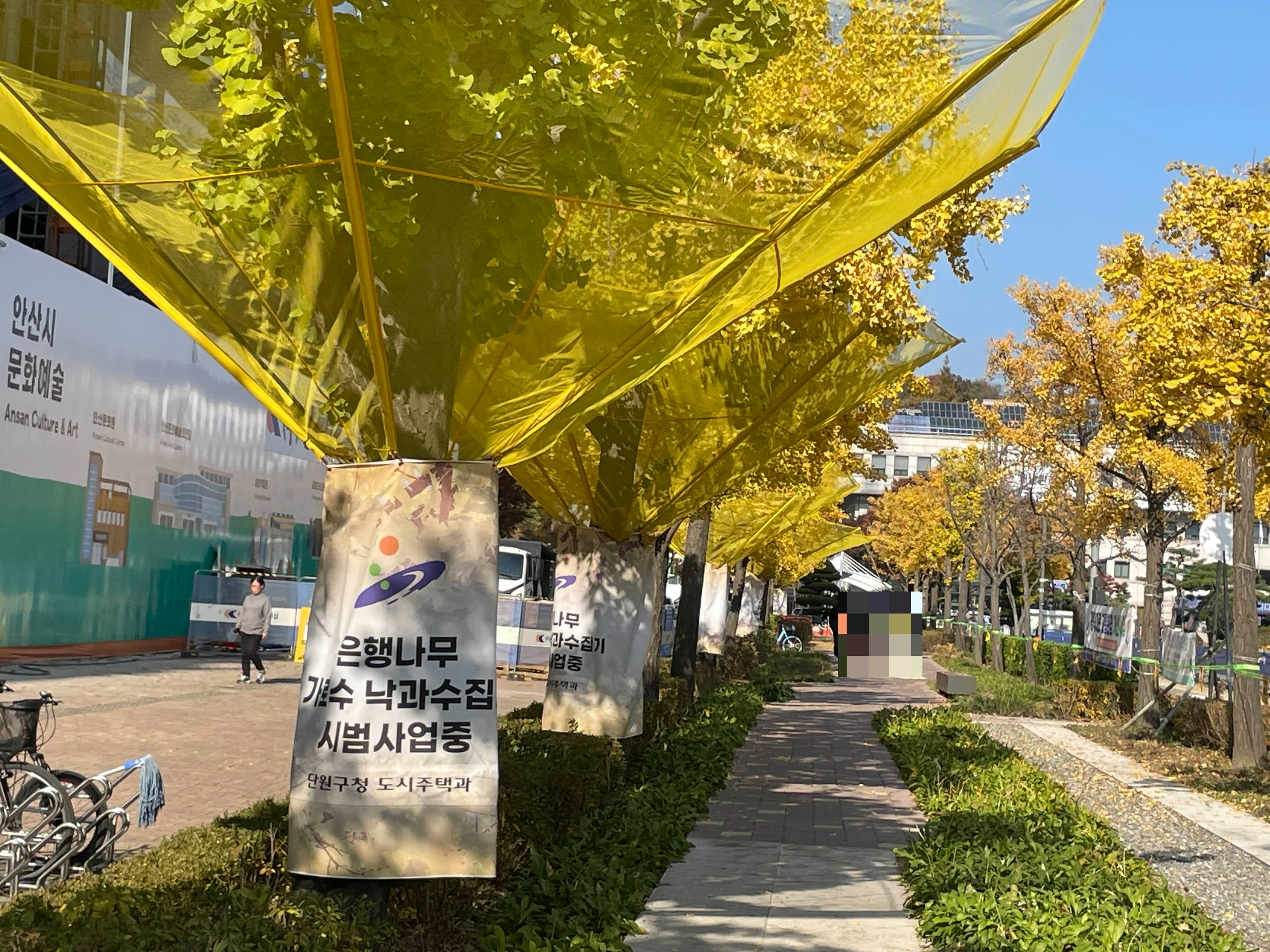 버스타고 안산시청 정류장에서 내려 안산고용복지센터로 가는 길인데 은행나무가 샛노랗게 된 모습이 너무 예쁘더라구요. 은행나무에 노란 망을 대 놓았는데 저게 뭔가 했더니 낙과 수집 시범사업중이라고 하네요. 저게 있으면 냄새나는 은행 밟아서 불쾌할 일도 없고 뭉개지지 않은 온전한 은행열매를 모을 수 있어서 좋을 것 같았어요.