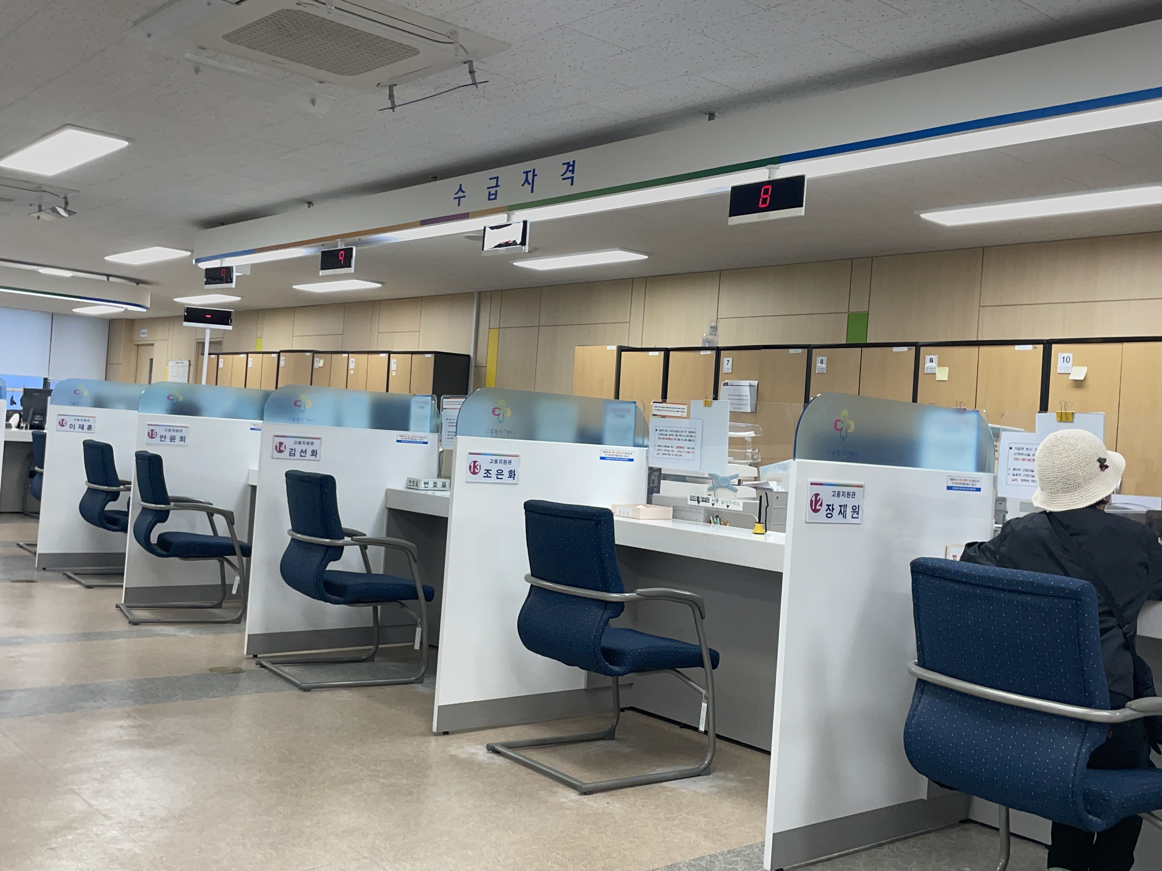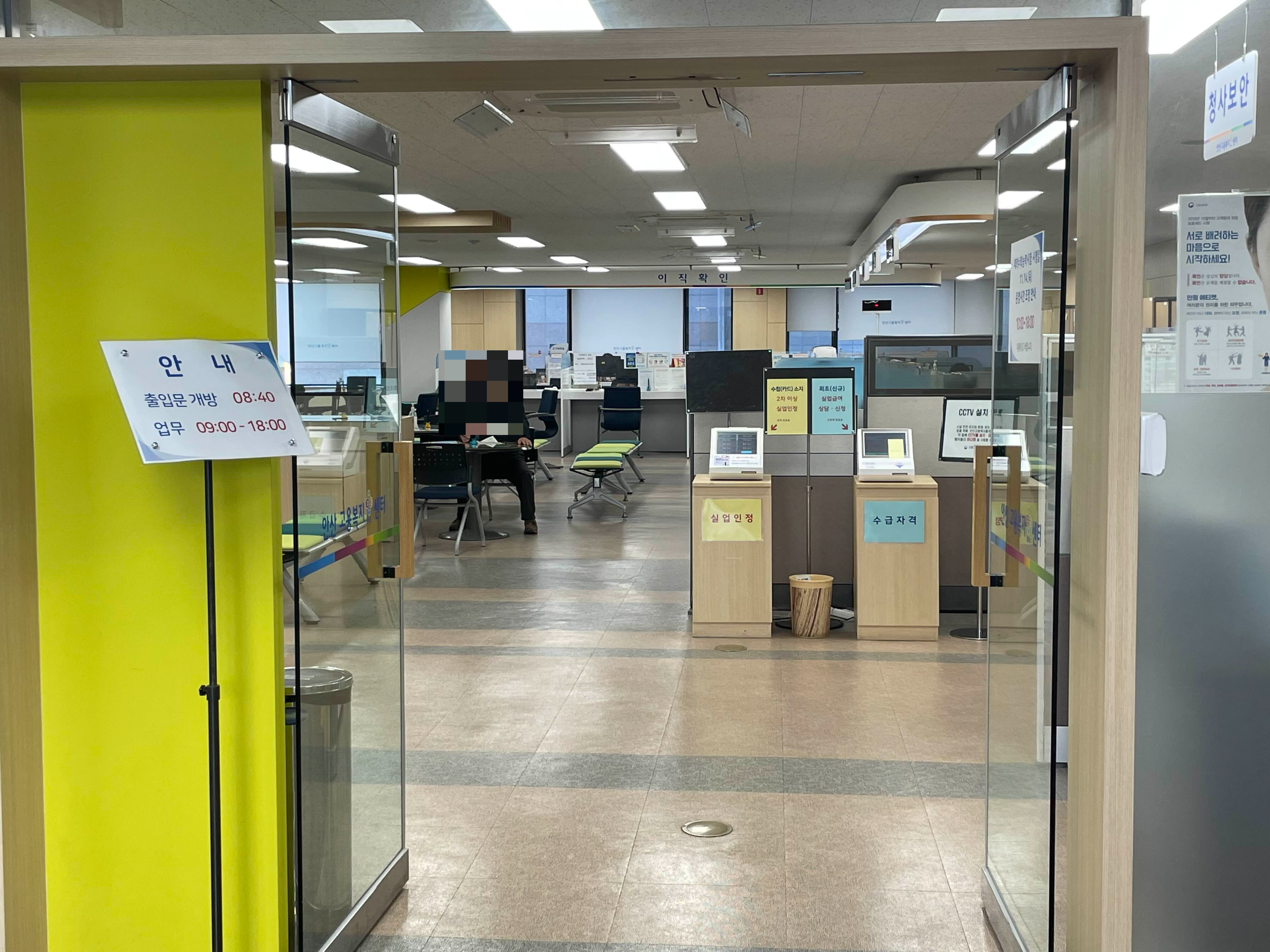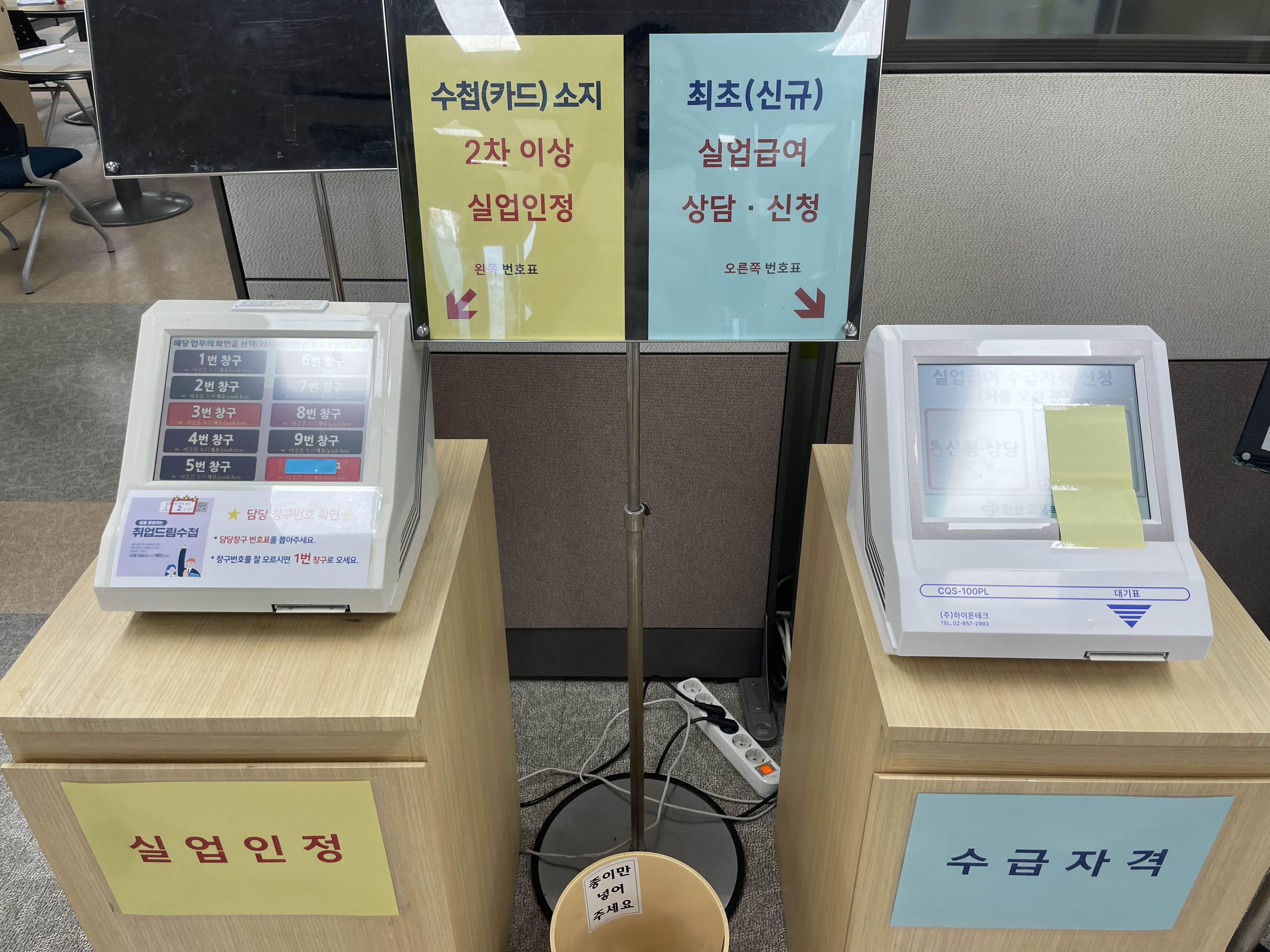 안산고용복지플러스센터 업무시간은 09:00~18:00 인데, 출입문 개방은 좀 더 빠른 오전8시 40분이에요. 점심시간에도 교대근무로 운영하고 있으니 업무시간 안에 아무때나 방문하면 됩니다. 전 실업급여 최초 신청이기 때문에 오른쪽 수급자격 번호표를 뽑고 앉아서 기다렸어요.