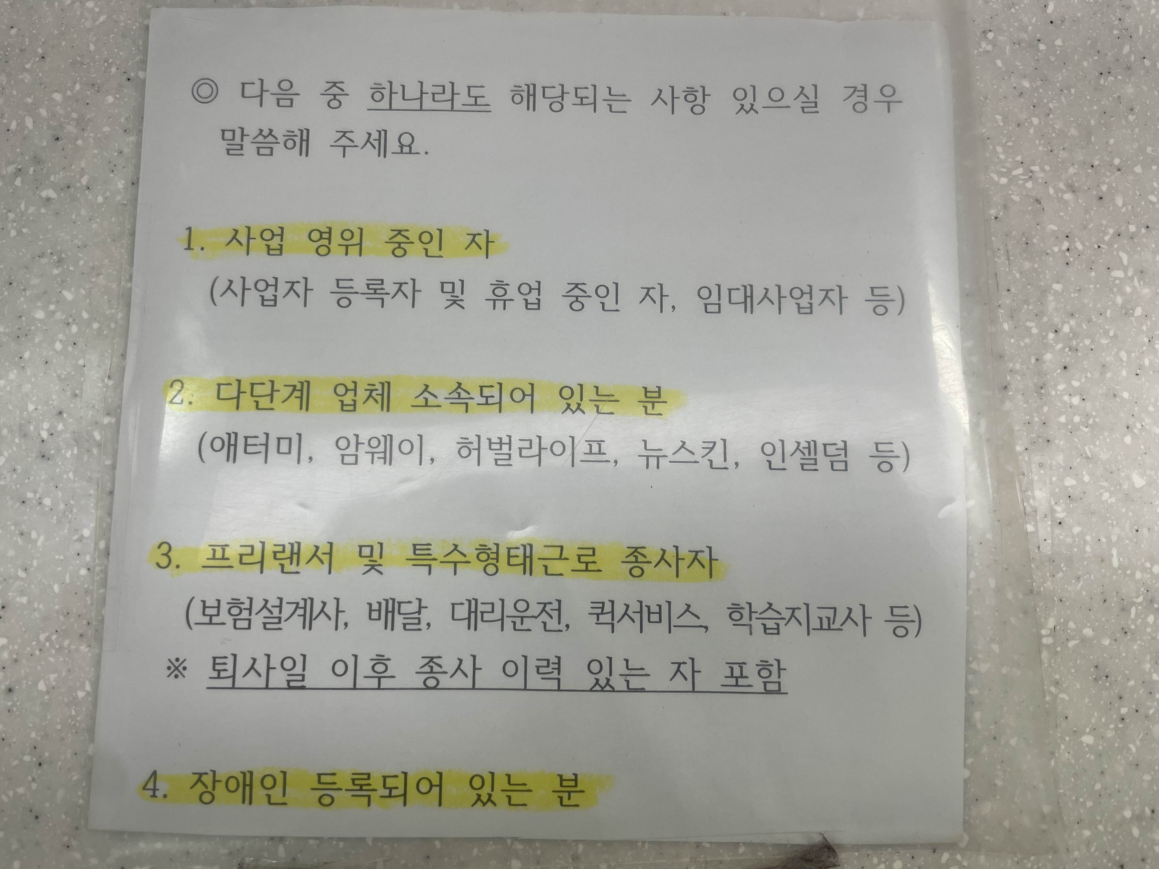 참고로 1. 사업 영위 중인 경우 2. 다단계 업체 소속되어 있는 분 3. 프리랜서 및 특수형대근로 종사자 4. 장애인 등록되어 있는 분은 따로 담당자분에게 말씀하셔야 합니다.