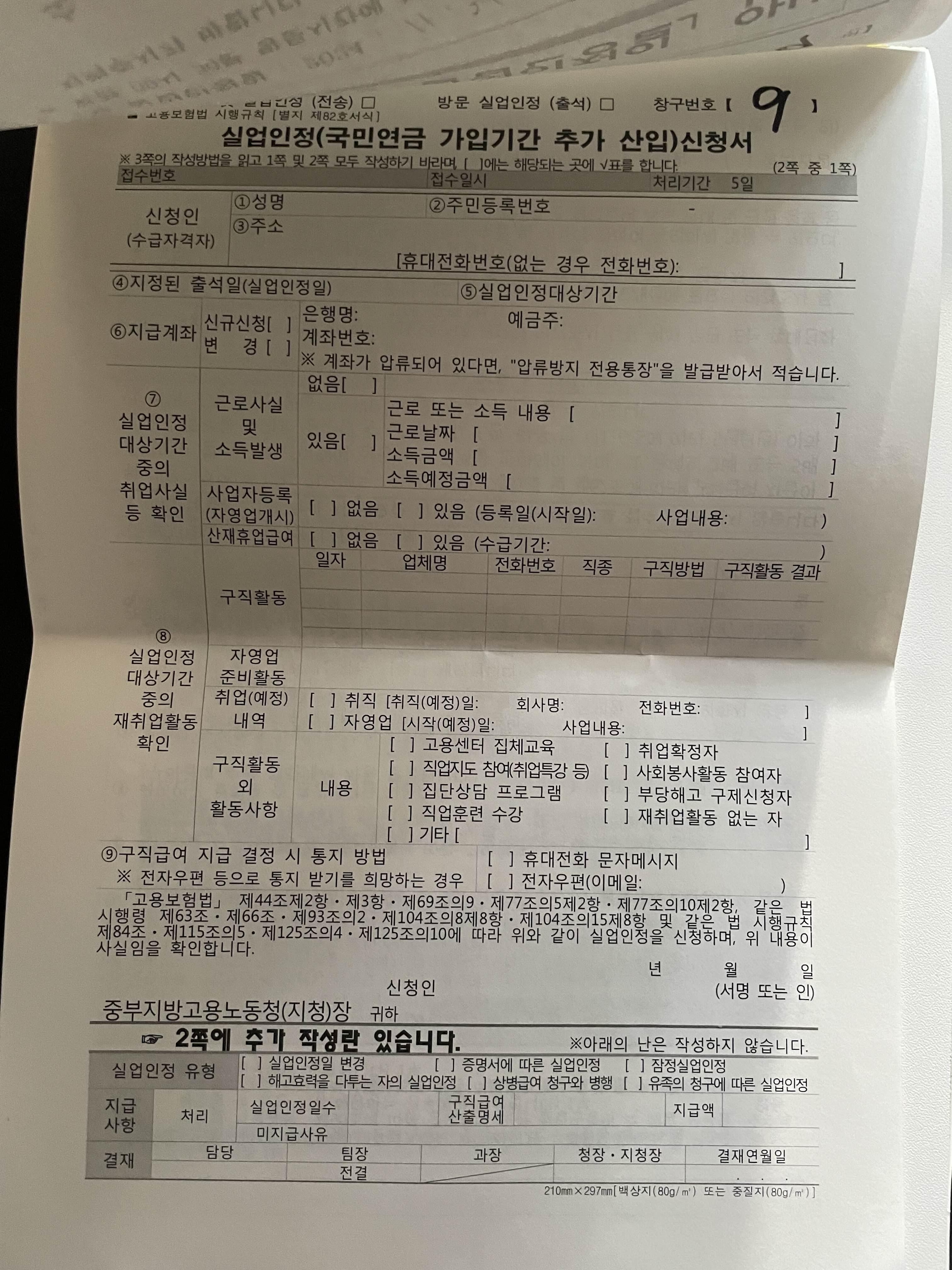 제 차례가 되어서 실업급여 신청하러 왔다고 말씀드리니, 신분증을 달라고 하십니다. 그리고 계약만료라고 말씀드리니 근로계약서를 가져 왔냐고 물어보시더라구요. 지참하지 못했으면 메일이나 팩스로 보내달라고 하니 걱정하지 않아도 됩니다. 그리고 수급자격 신청서를 담당자 안내에 따라 작성해서 제출하면 끝입니다.