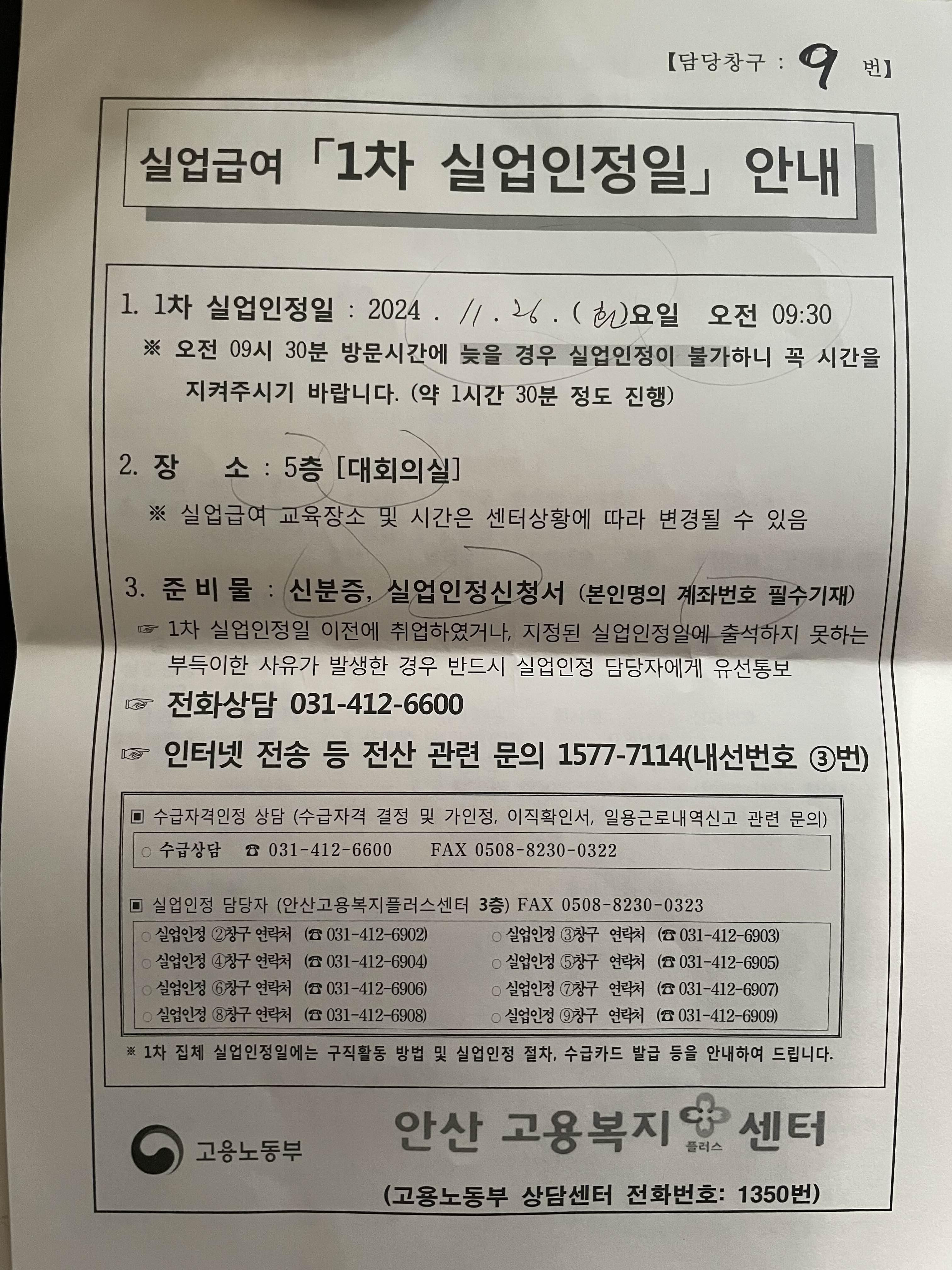 이렇게 안산고용복지플러스센터에서 실업급여 신청을 마쳤는데요. 마지막으로 담당자분이 1차 실업인정일 안내를 해주시네요. 안내해 주시는 날짜에 준비물 잘 챙겨서 방문하면 될 것 같습니다.