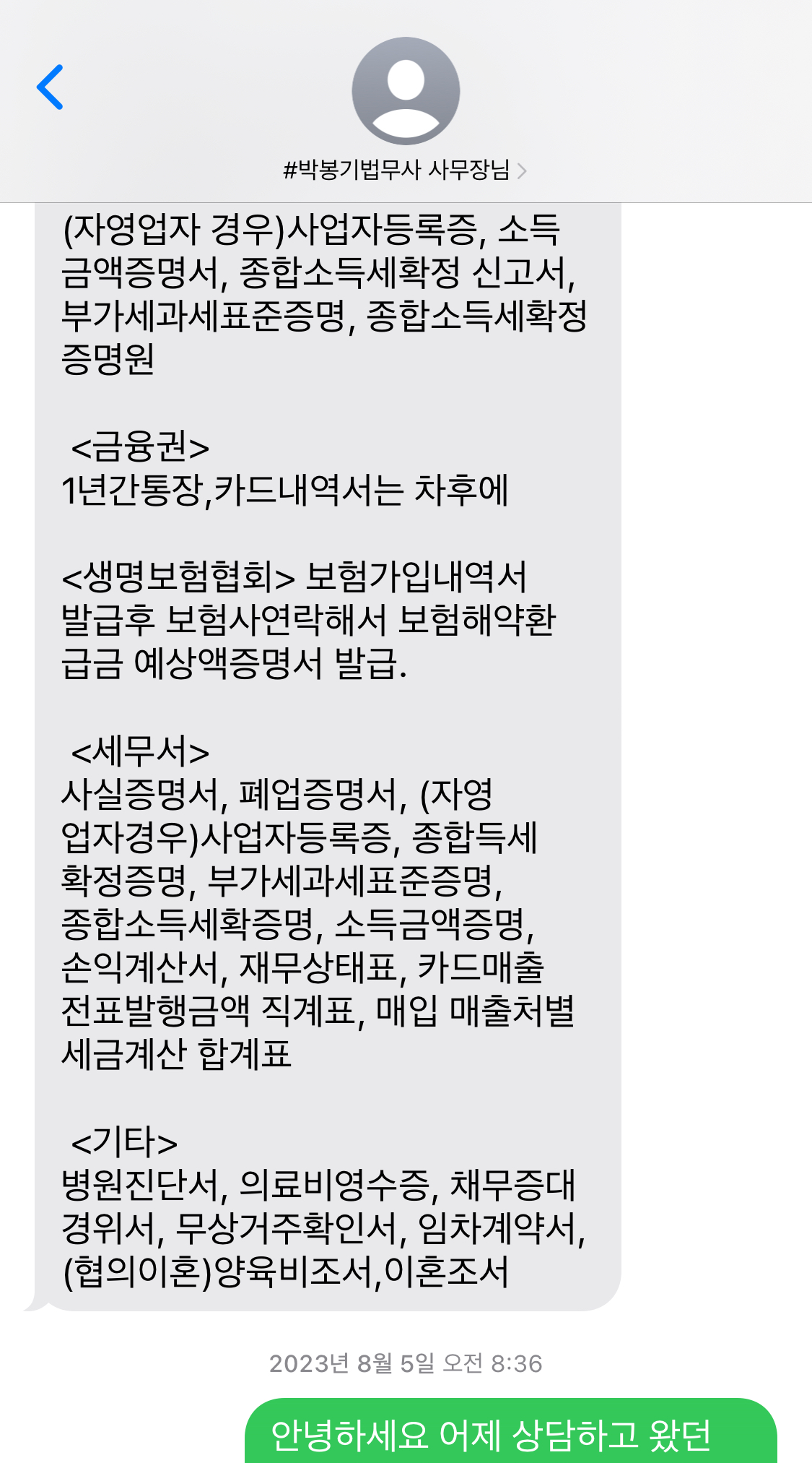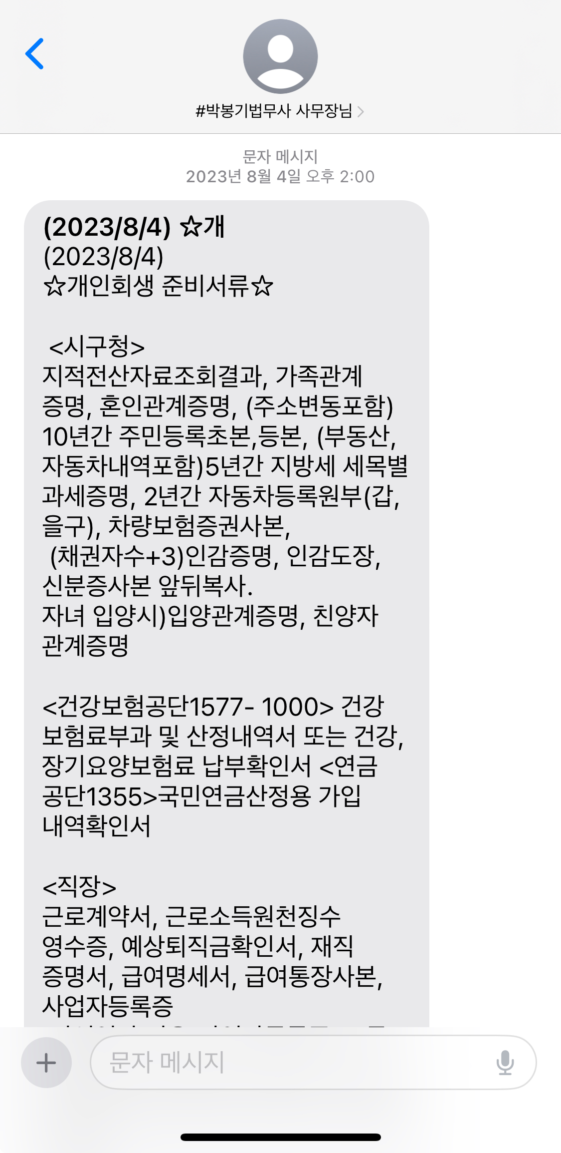 법무사 박봉기 사무소에 개인회생을 맡기기로 결정한 다음, 사무장님이 준비해야 될 서류 목록을 문자로 보내주셨어요.