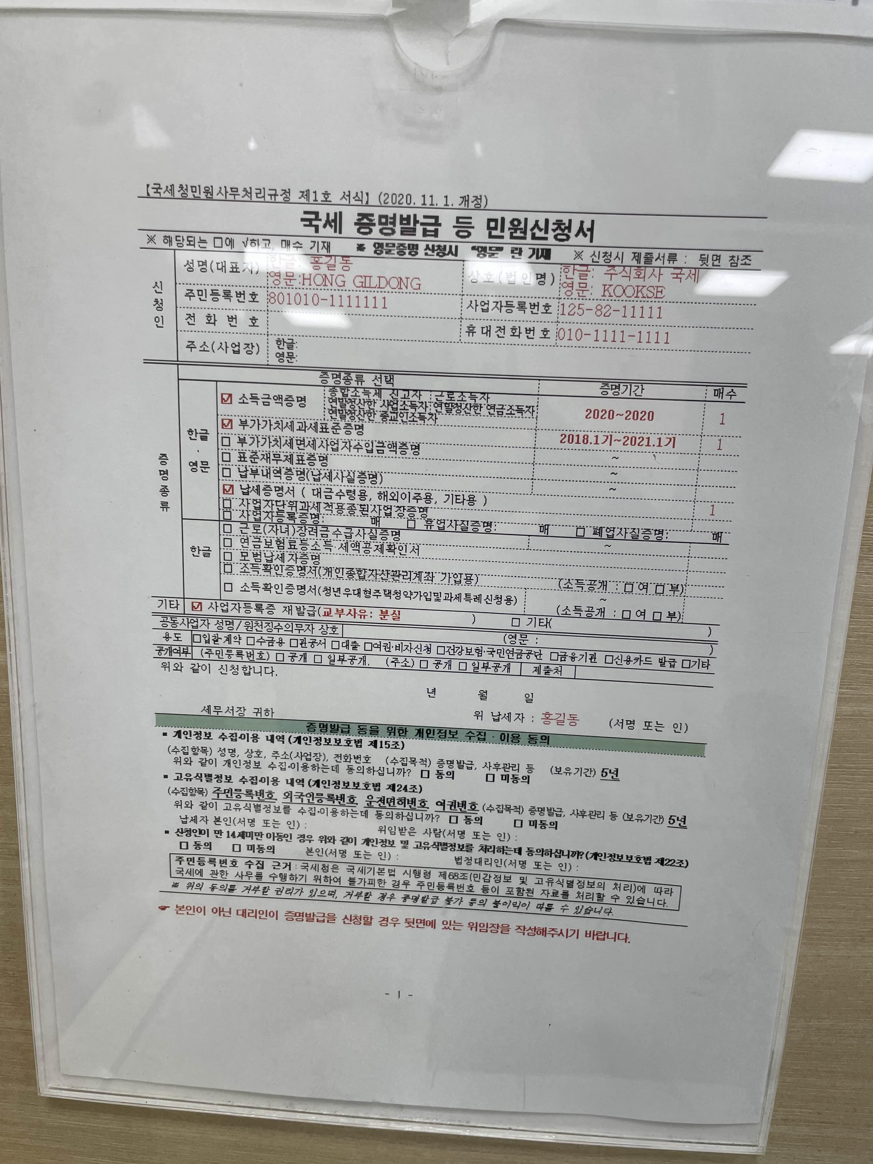 들어가니 바로 민원봉사실이 보이더라구요. 거기서 증명발급 번호표 뽑고, 민원신청서를 작성 (회사정보 기재, 사업자등록증 재발급에 체크) 한 후 창구에 제출하면 신분증 확인한 뒤 바로 발급해주더군요. 민원인이 없어 대기시간도 없었고 발급 처리가 아주 빨라서 좋았습니다 ㅎㅎ