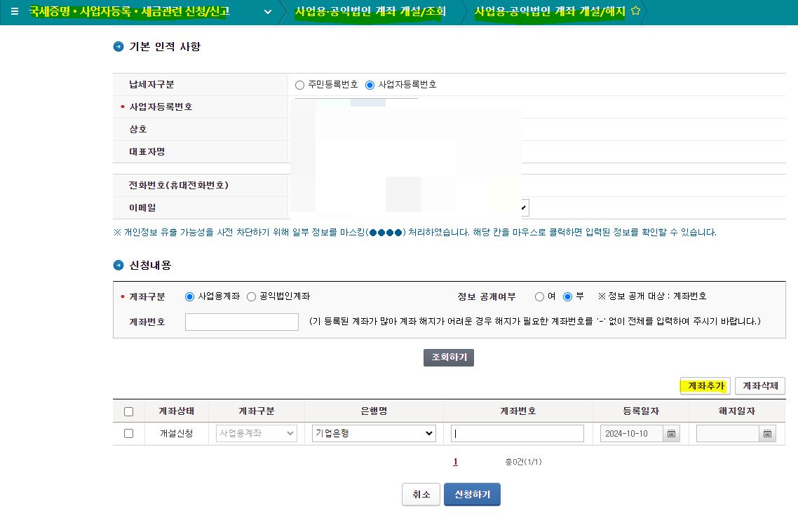 국세청 홈텍스 사이트(https://www.hometax.go.kr/websquare/websquare.html?w2xPath=/ui/pp/index_pp.xml) 에서 간편인증 로그인 후, 상단 메뉴에 국세증명, 사업자등록, 세금관련 신청/신고 - 사업용,공익법인 계좌 개설/조회 - 사업용, 공익법인 계좌 개설/해지 순으로 들어갑니다.