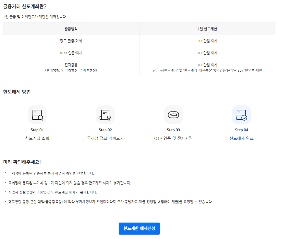 기업은행 개인사업자통장 한도제한 해제하려면 어떻게 해야 할까?
